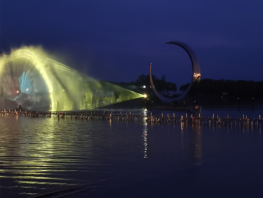 大纵湖旅游景区推出了东晋古城引云阁灯光艺术投影秀《印象·大纵湖》,将现代化的科技艺术思维与盐城独具特色的历史文化、人文风情相结合,以裸眼3D效果和震撼的电影特效呈现一段全新的视觉盛宴,打造东晋水城光影新地标。